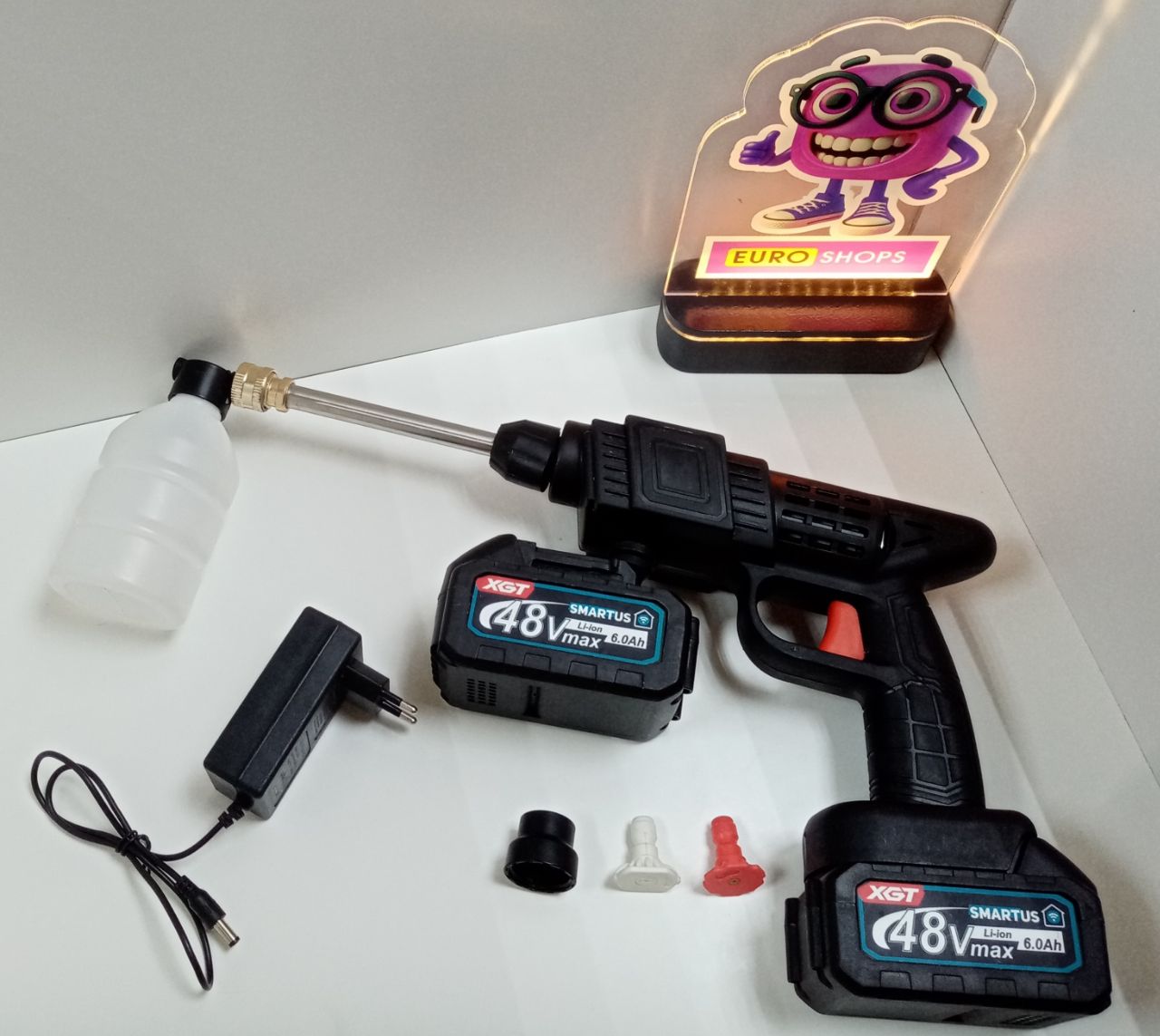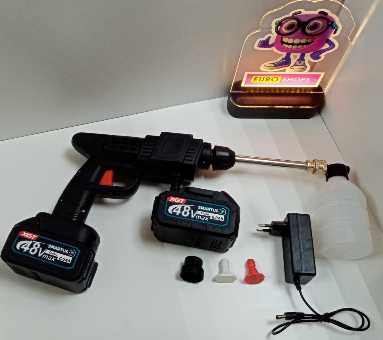 Мийка високого тиску; з'єднувач для змішувача; сплінкери – 2 шт.; частина від перехідника; піноутворювач; акумулятори - 2 шт.; зарядний пристрій; кейс.