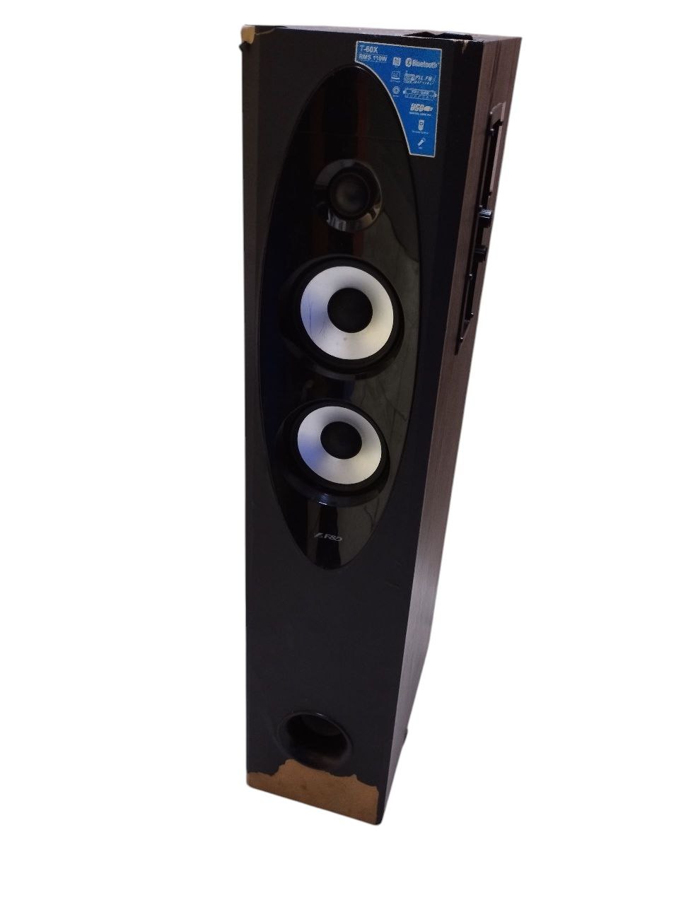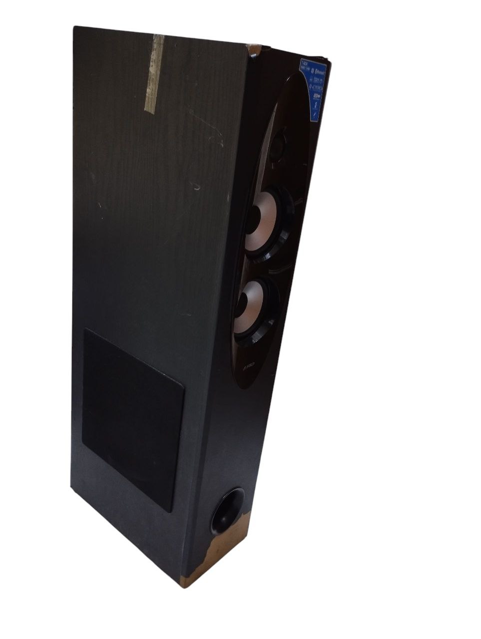 Потертості по корпусу,обдерта внизу,грає добре,колонка одна