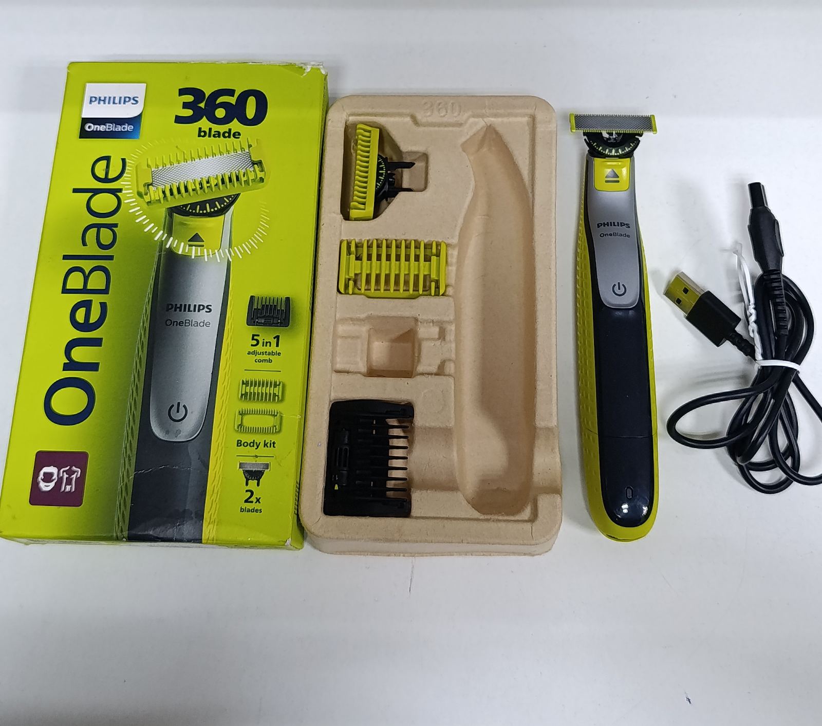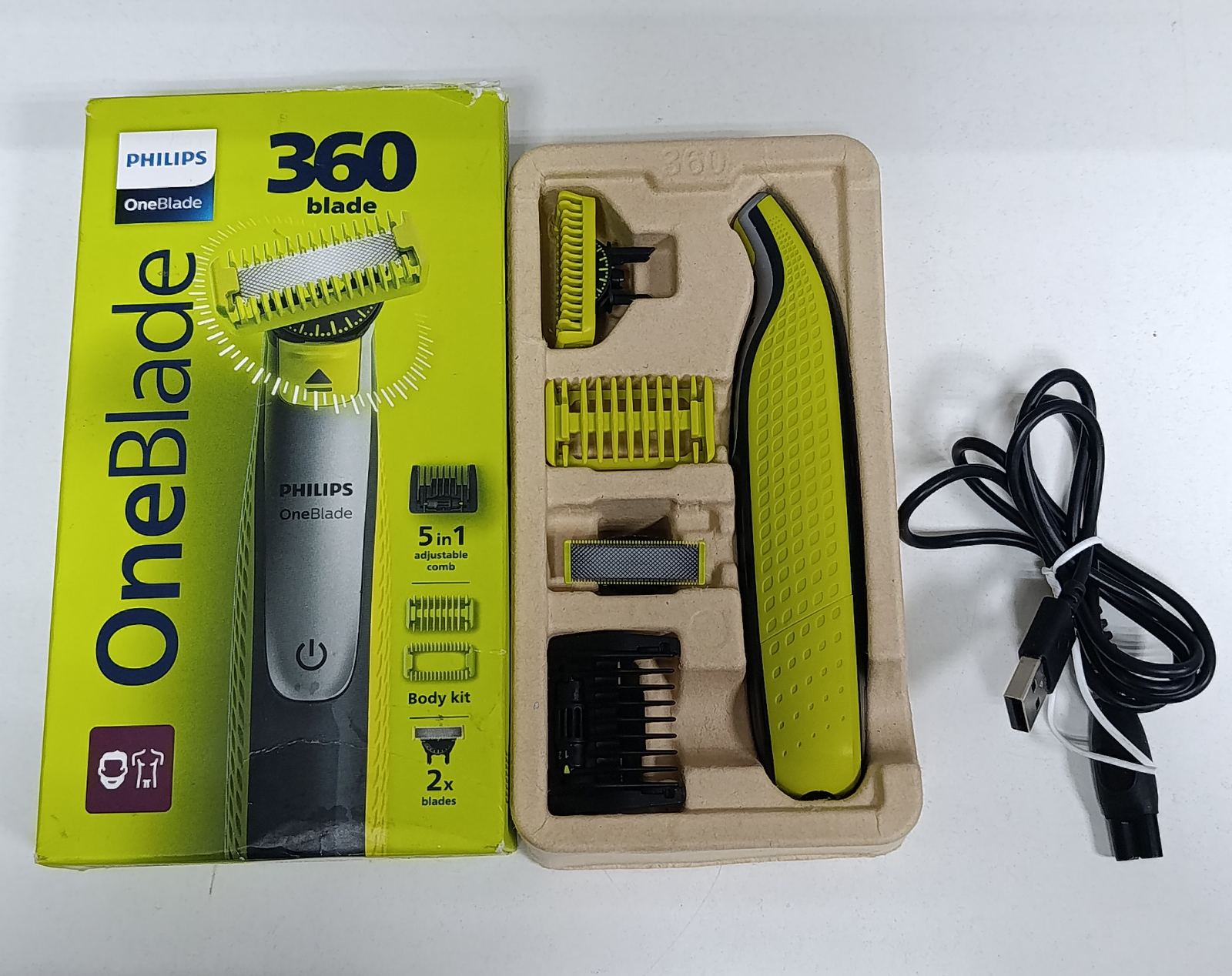 2 леза ,3 насадки , USB дріт для зарядки ,пошкоджена коробка