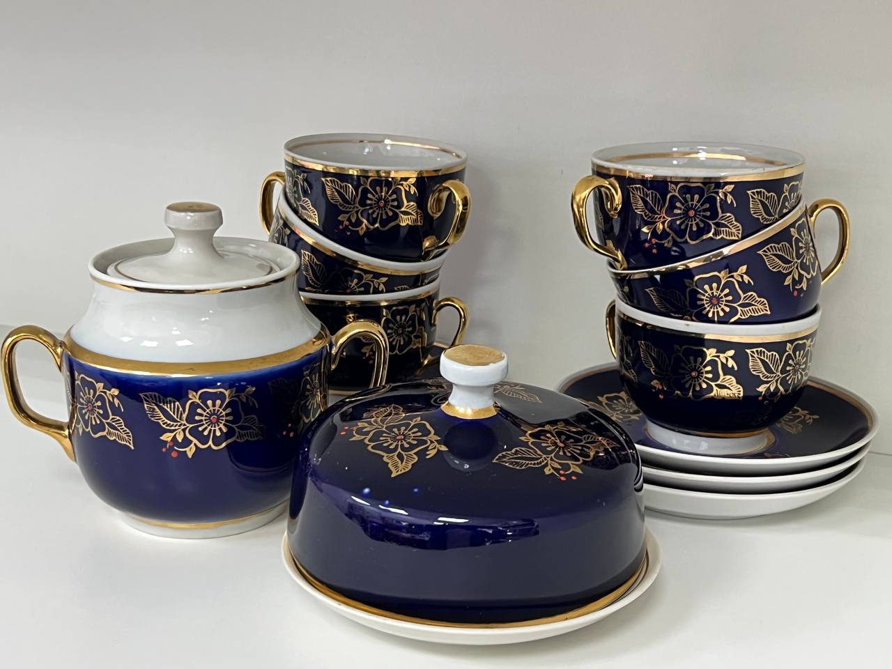 6 чашок, 5 блюдець, сахарниця, маслянка