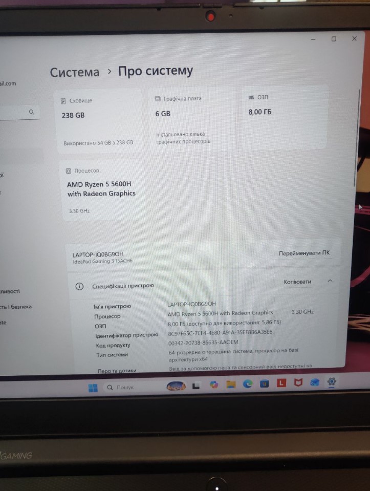 Ноутбук Lenovo IdeaPad Gaming 3 15ACH6 AMD Ryzen 5 5600H/RAM8GB/SSD256GB/4096MB GeForce GTX1650