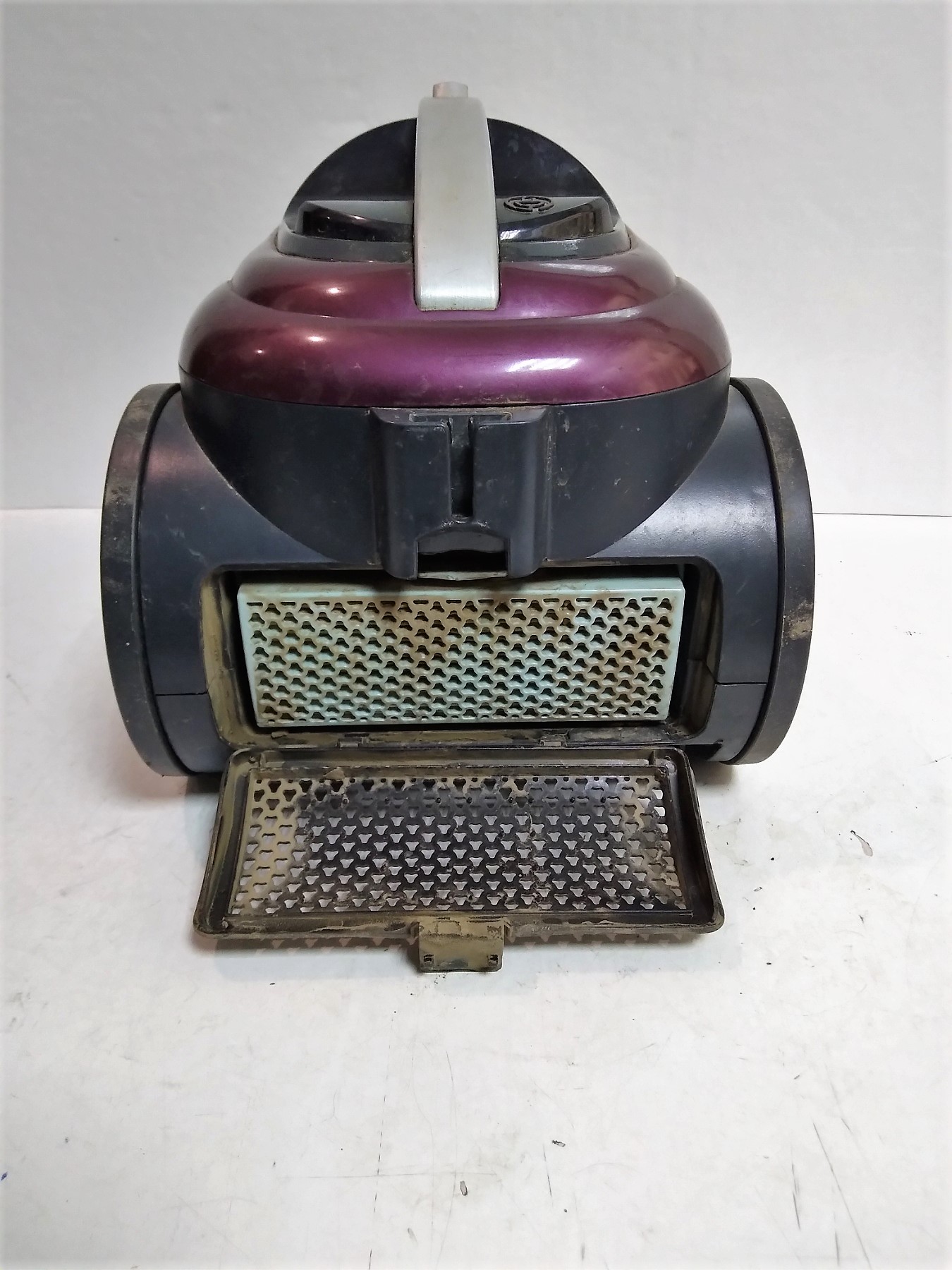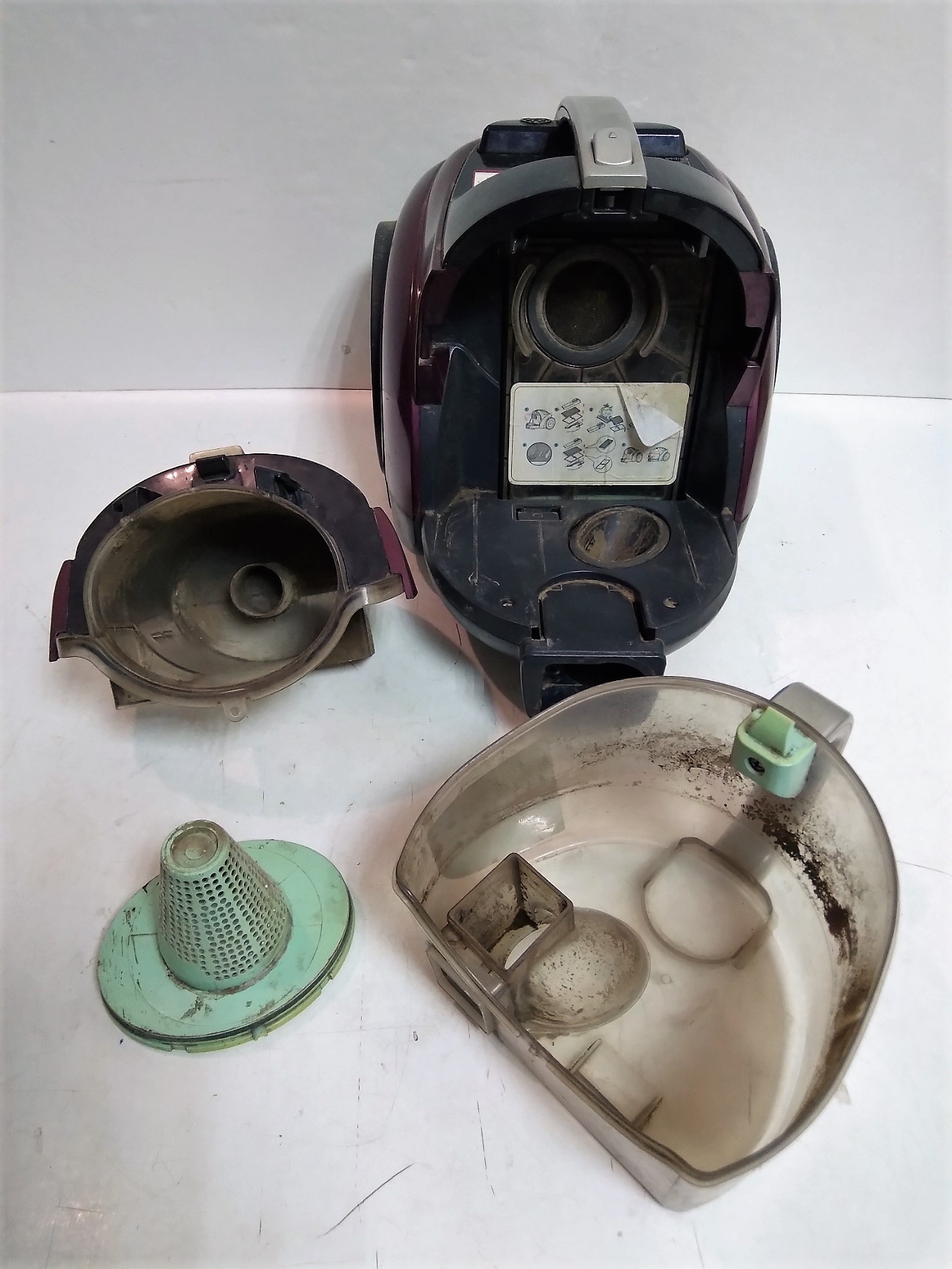 ПРАЦЮЄ ТІЛЬКИ З ВОДОЮ, брудний всередині та зовні, клавіші вкл/викл та оберти тільки на ручці, іноді не вимикається, фільтр брудний, тільки одна щітка