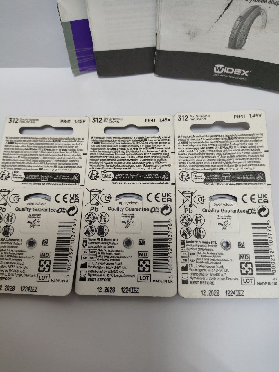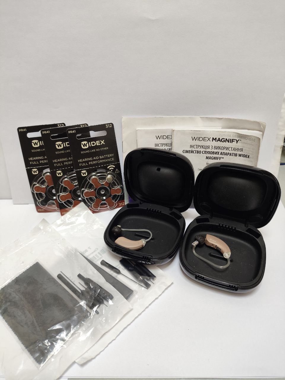 Батарейки, 2 слухових апарата, інструкція, серветки та щітки