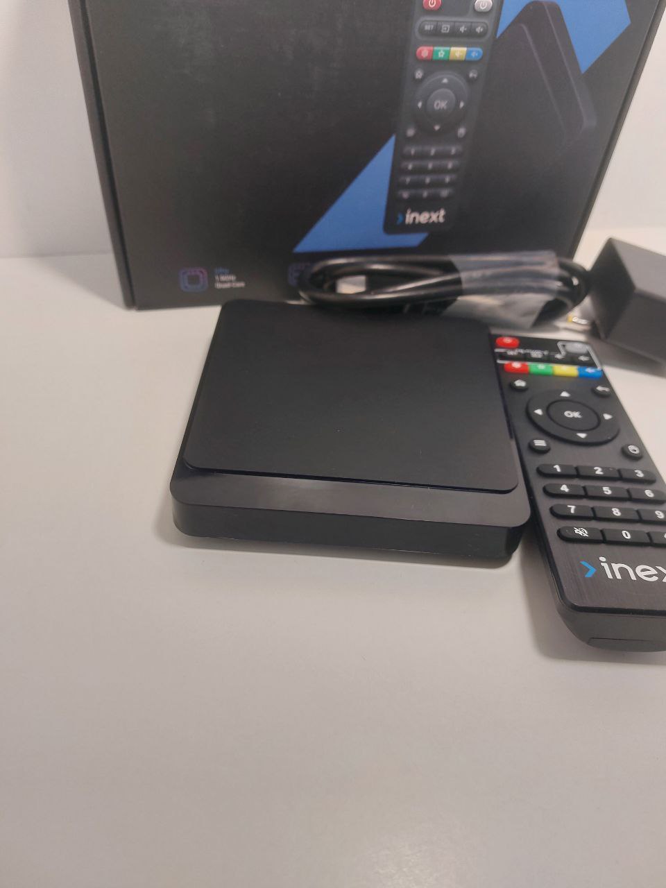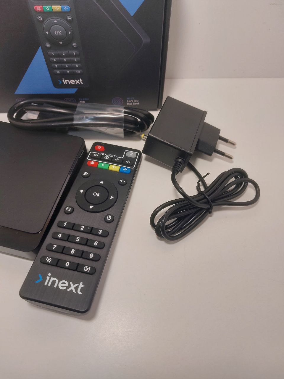 коробка, пульт, блок живлення, кабель