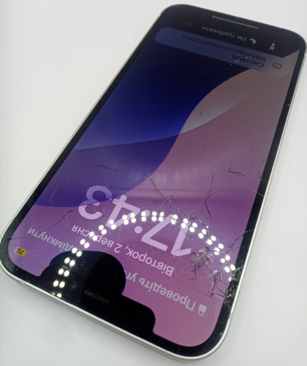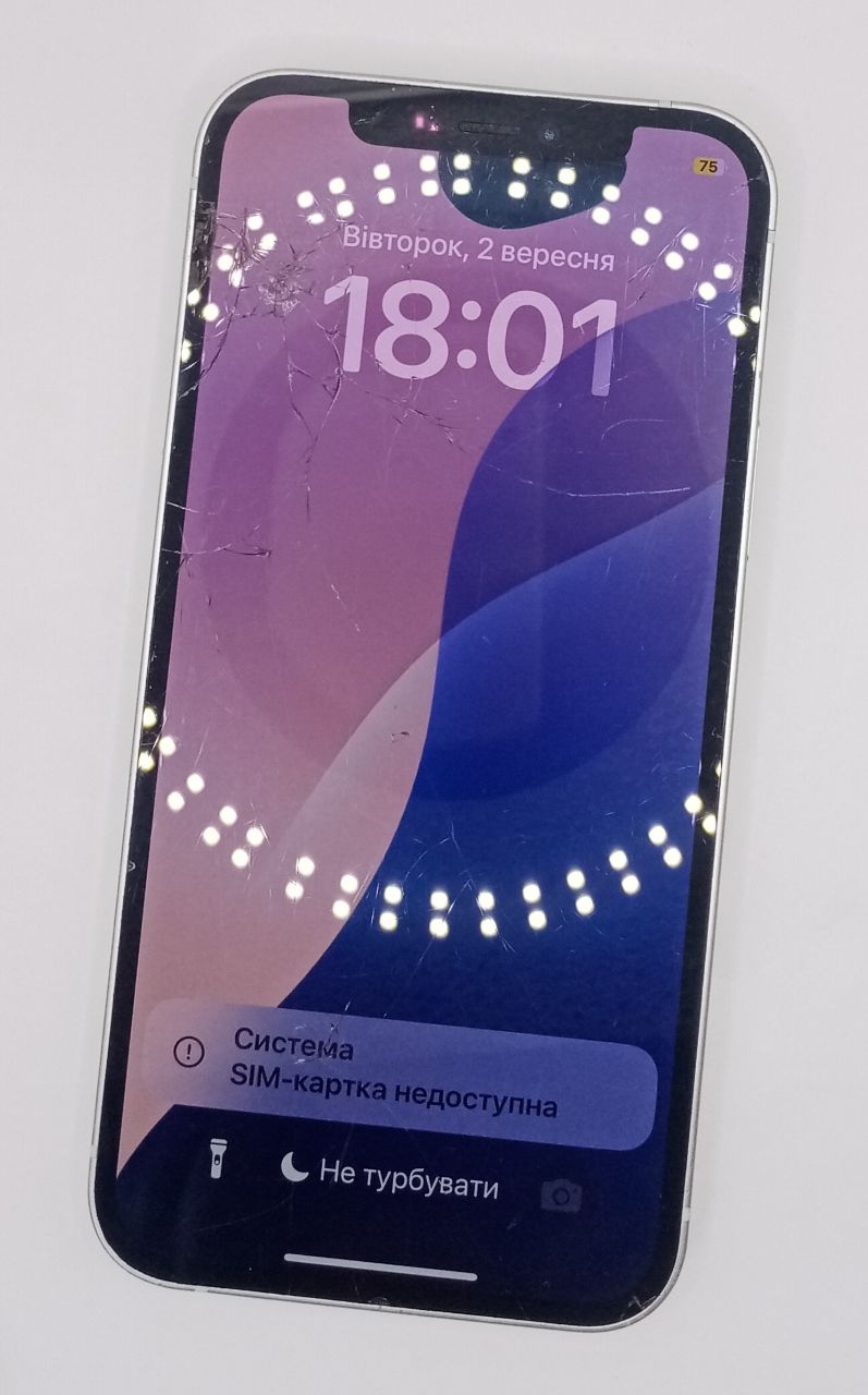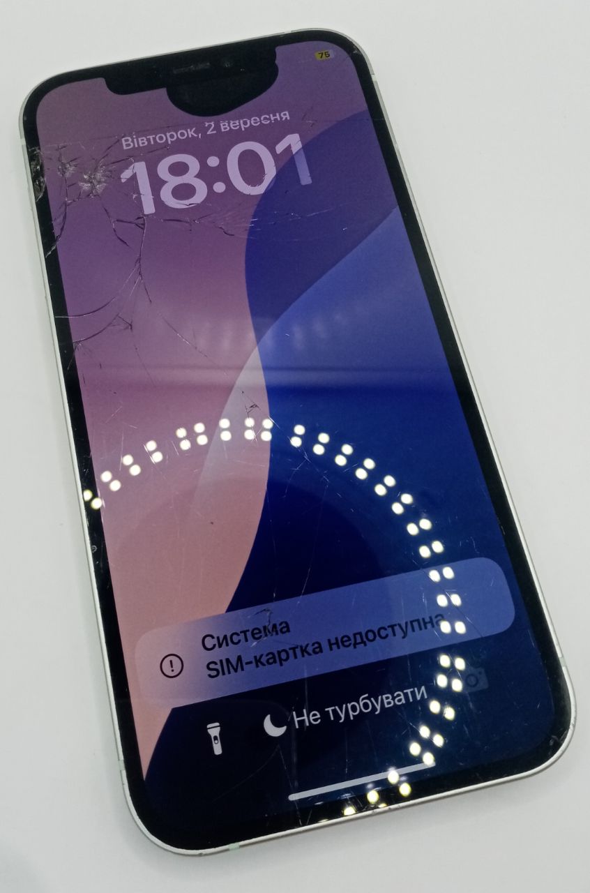 iCloud on, сліди падіння, екран не працює, чорна пляма на екрані, тріщини і подряпини на екрані (немає шматочків екрану), тріщини по корпусу (немає шматочків), потертості і вм'ятинки по корпусу, без комплекту, увімкнений режим не турбувати.