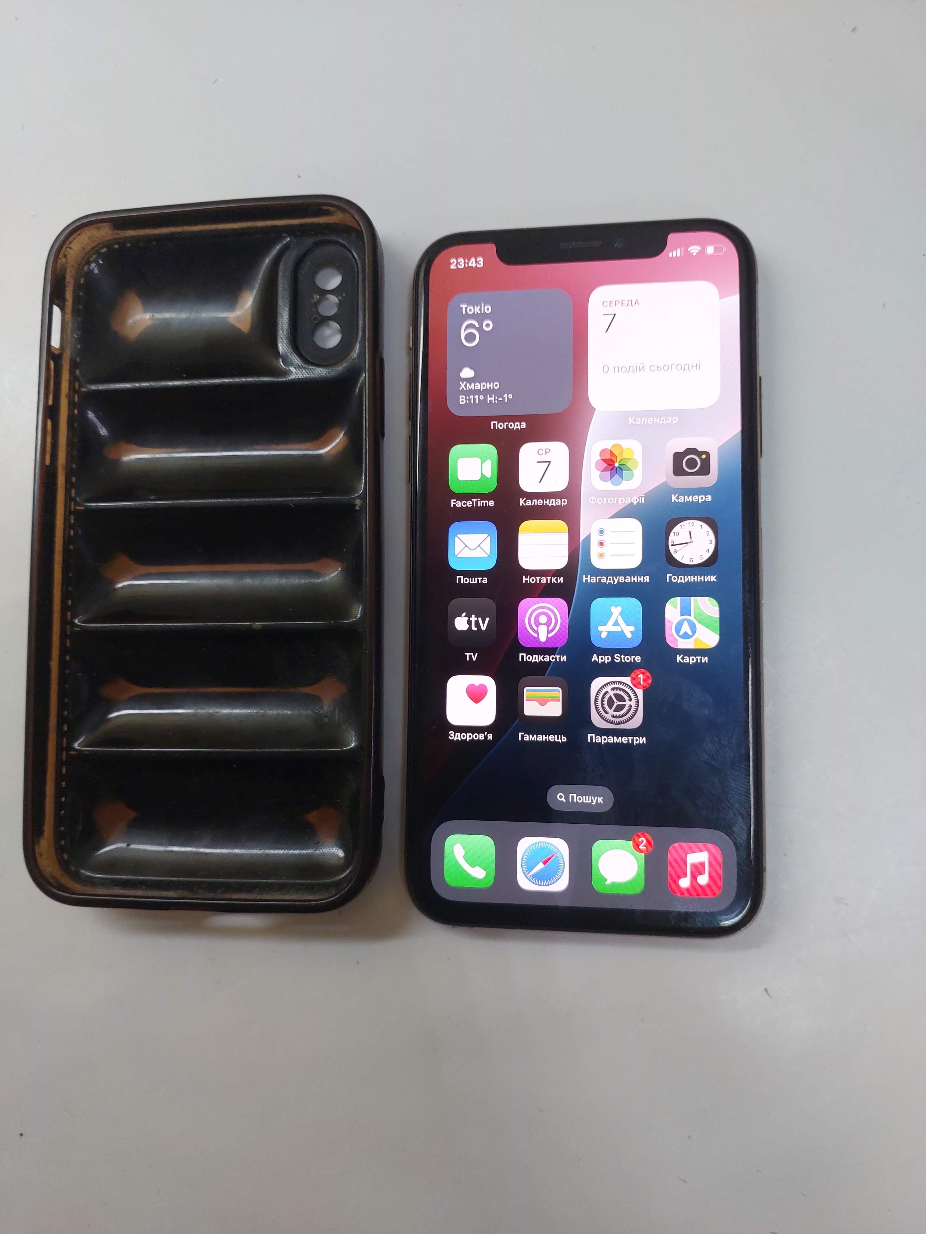 Побит сзаду. Акб 77%. FaceID не працює. Подряпини на екрані. Динамік (мелодія дзвінка) тихий. Динамік (до вуха) рипить. Не на всі usb-кабеля реагує (заряджається)