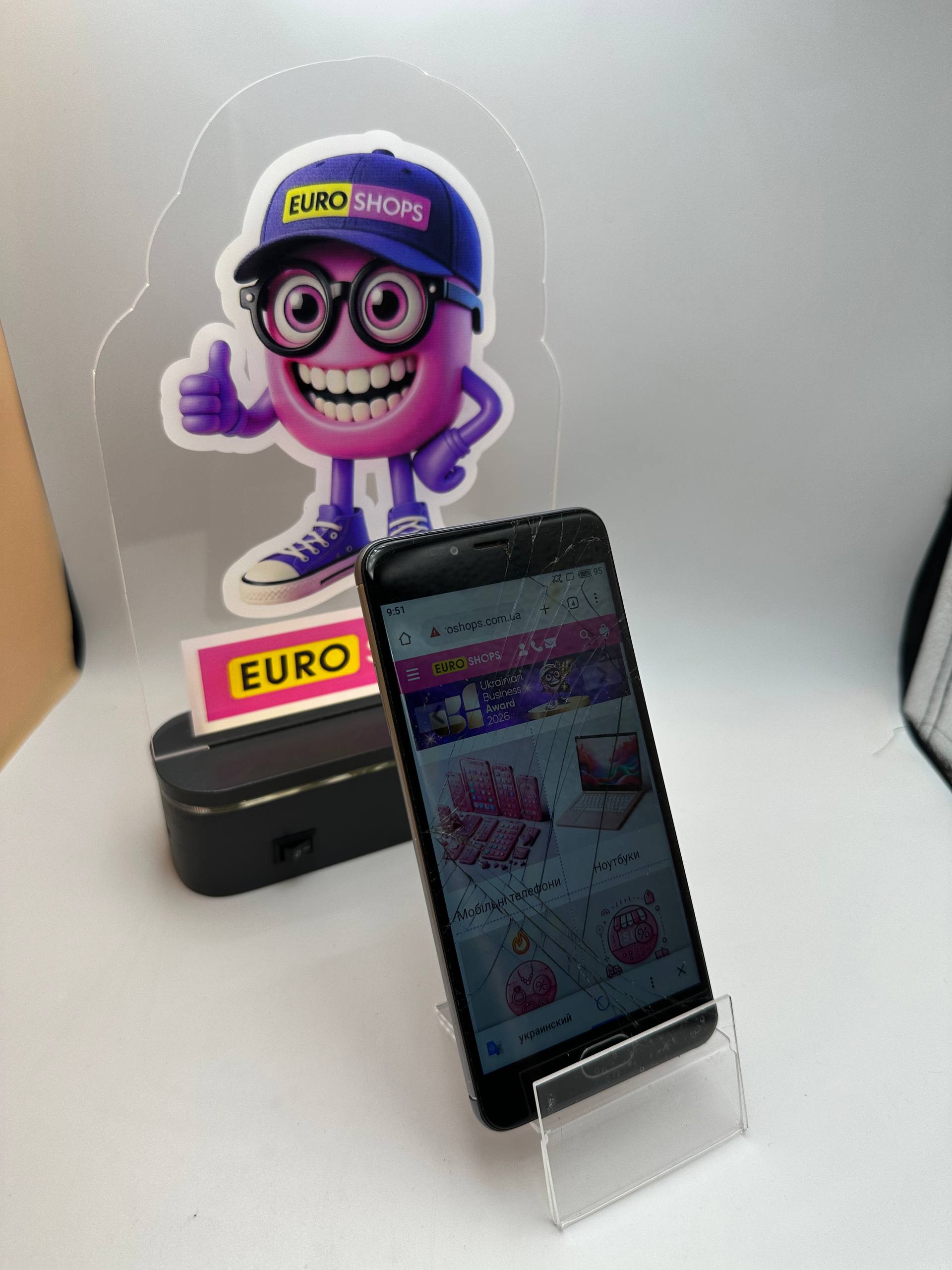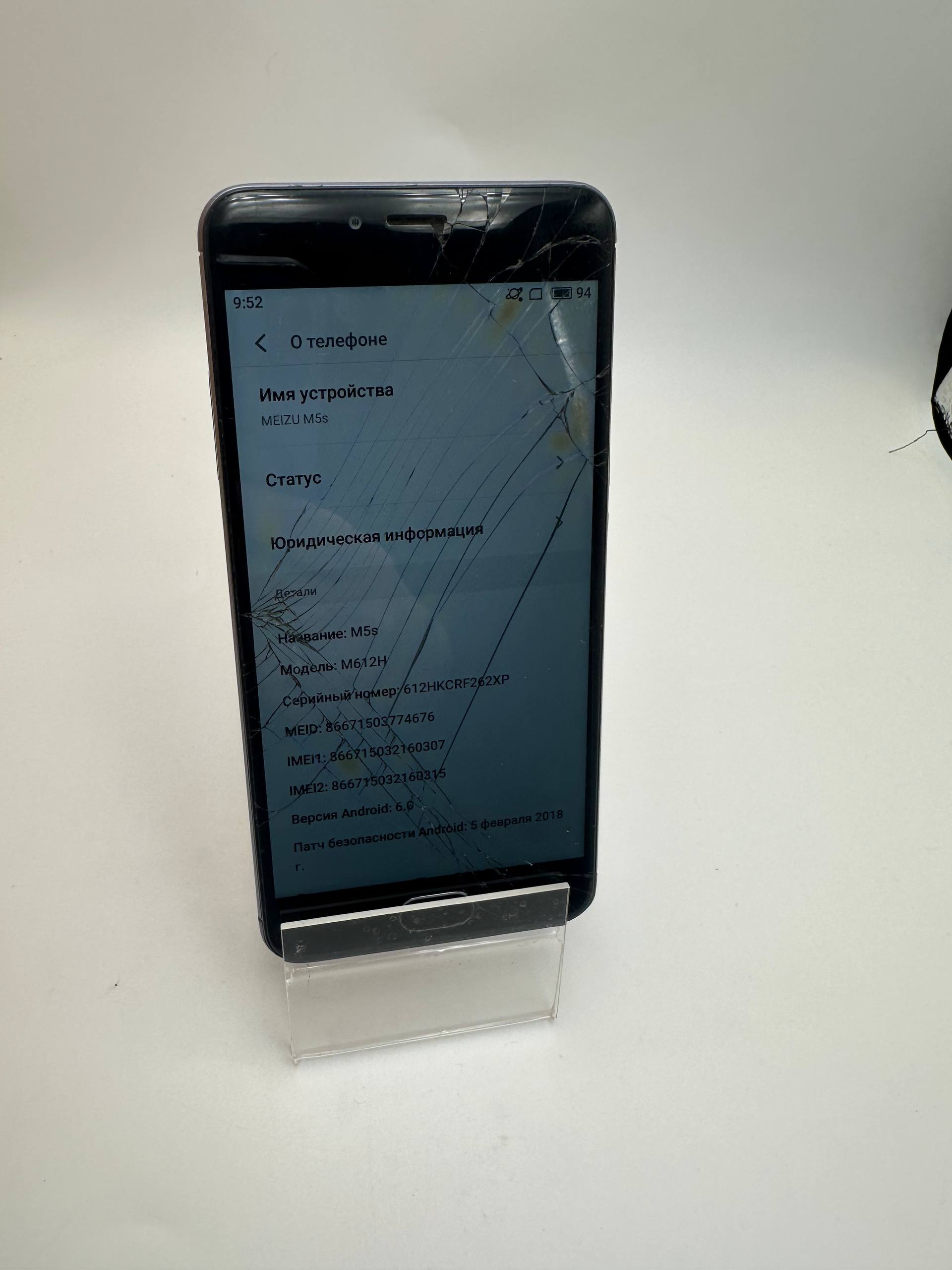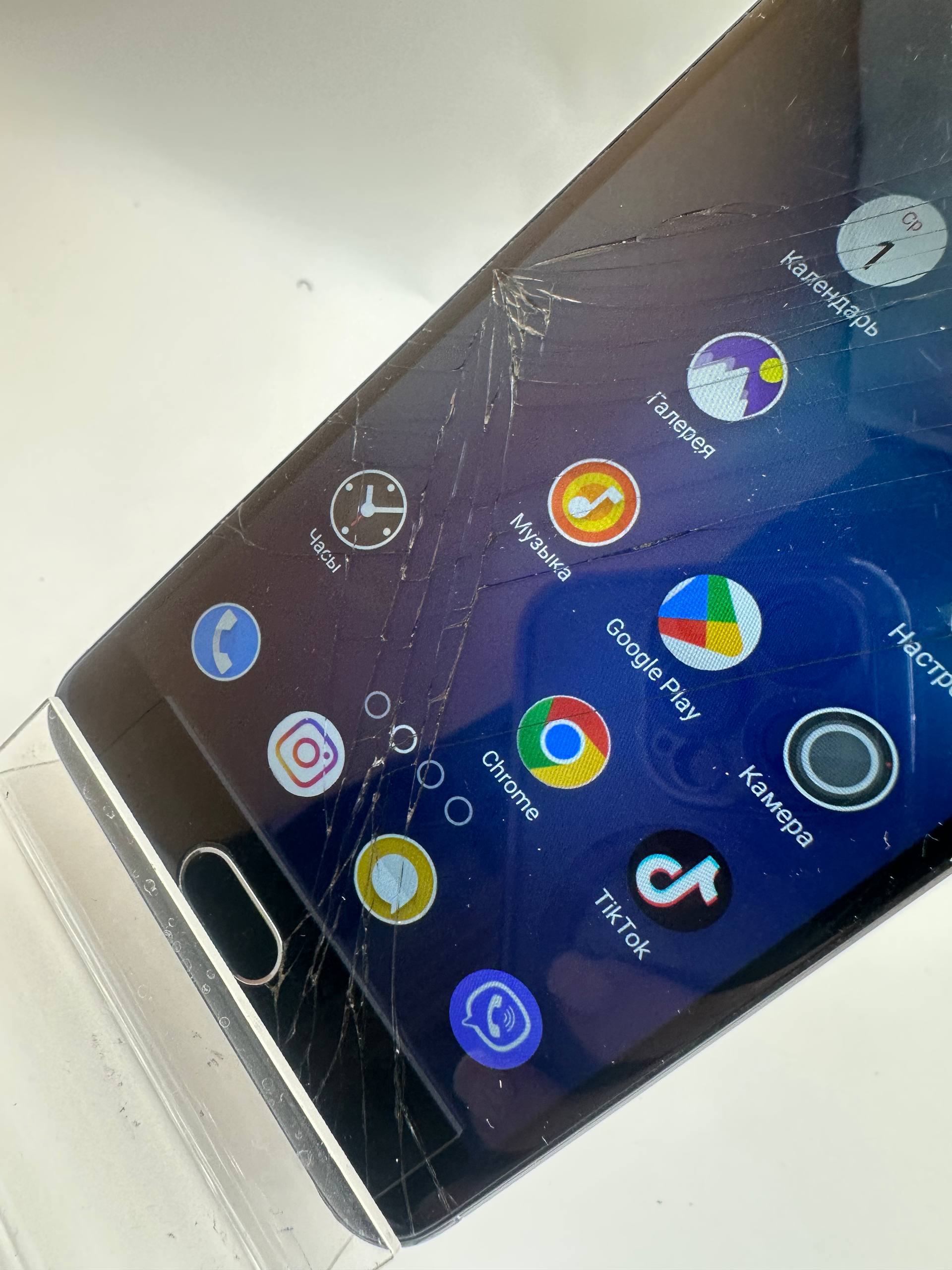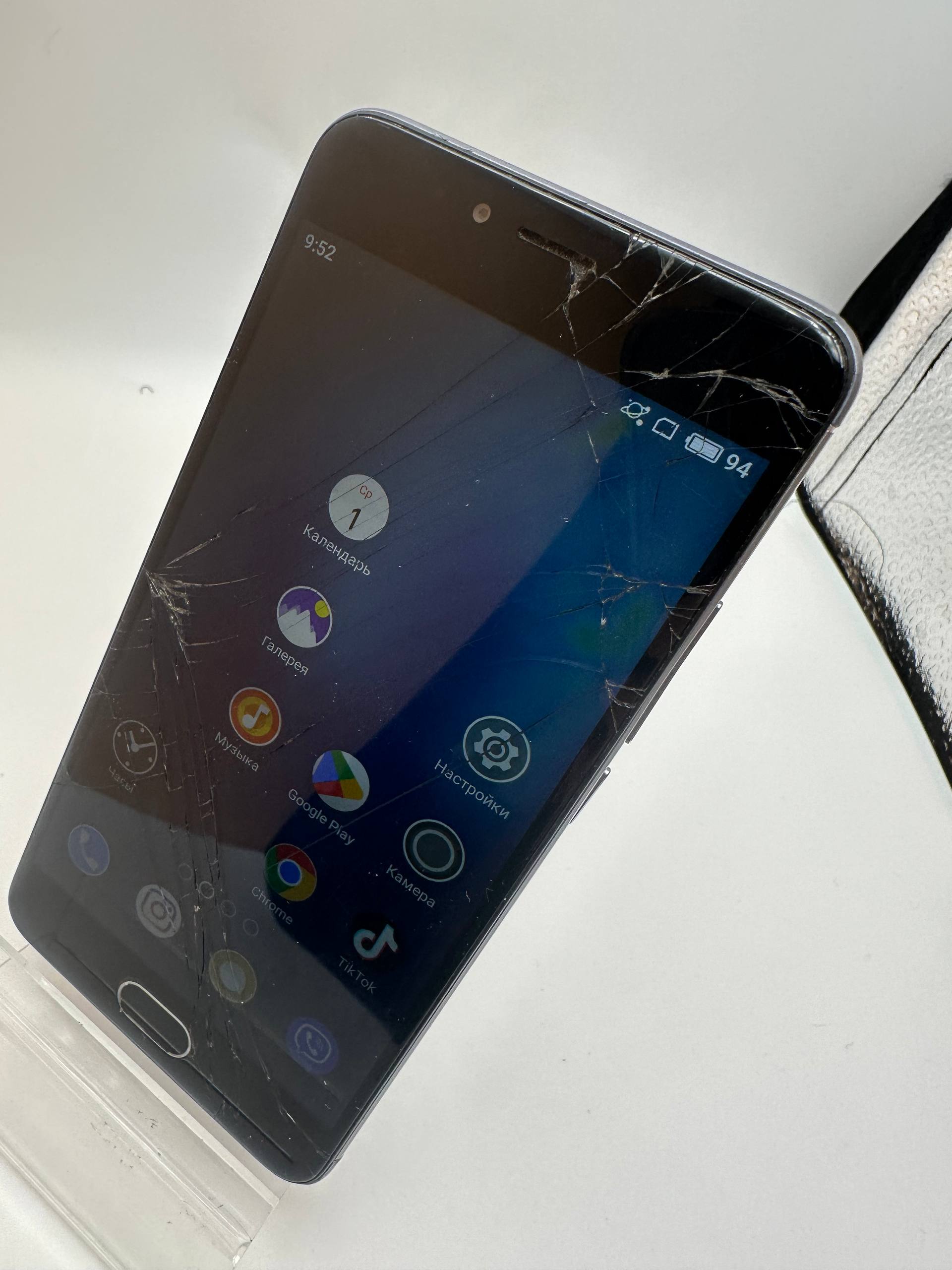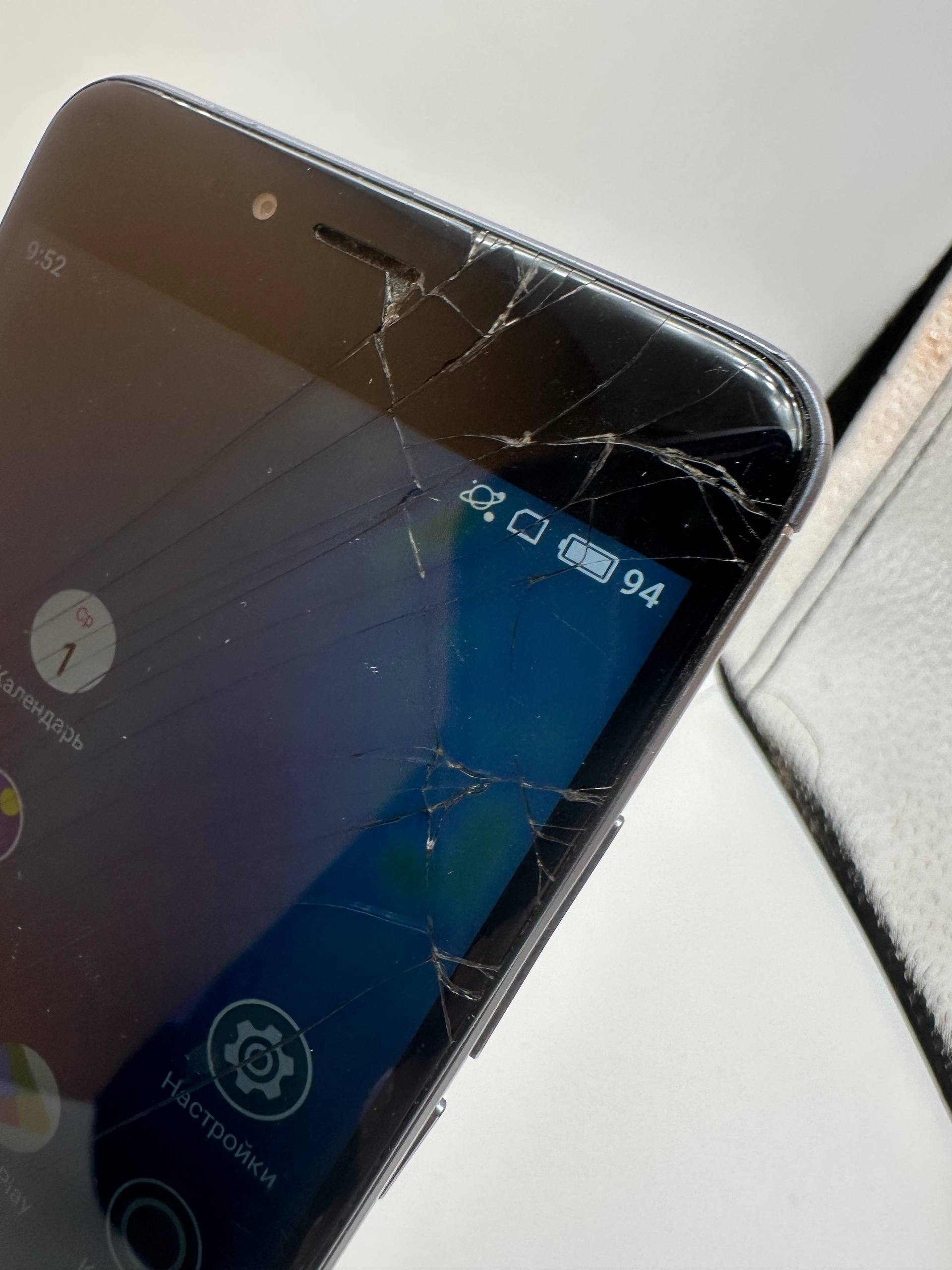 Задовільний стан; сліди використання, битий екран, є сліпі зоні серсору; присутні гугл аккаунти; плями на екрані