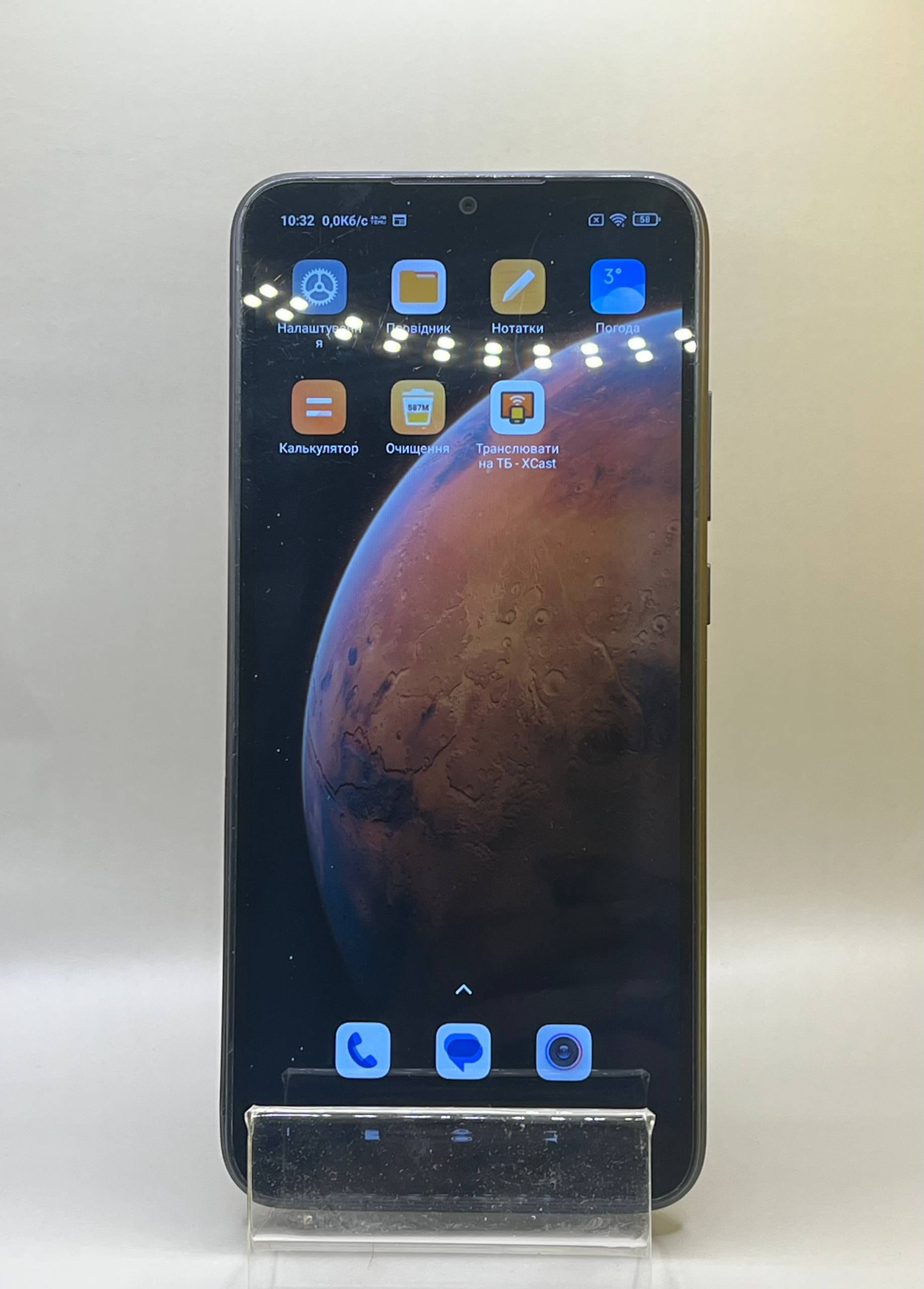 пошарпаний корпус, глибокі царапини на екрані, є два невеликих скола, на темному фоні проглядається велика сіра рамка