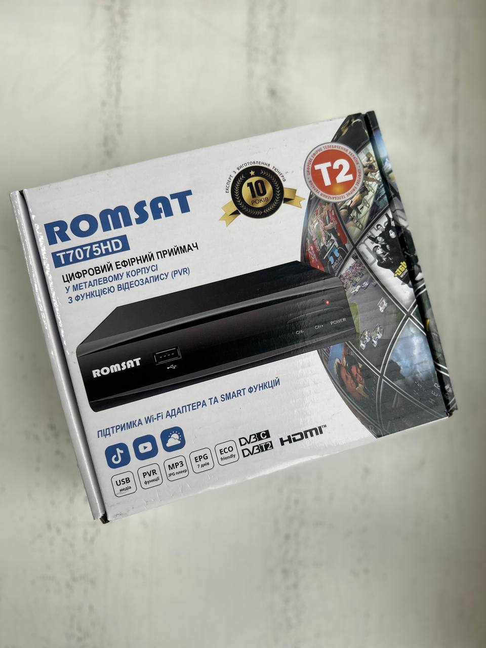 Тюнер Т2 Romsat T7075HD — сучасний цифровий ефірний ресивер для перегляду українського телебачення у форматі DVB-T2. Підтримує роздільну здатність до Full HD 1080p, має HDMI та AV-виходи, USB-порт для відтворення фото, відео та музики, а також функцію запису ефіру (PVR) та відкладеного перегляду (TimeShift). Зручне меню, швидкий пошук каналів, стабільний прийом навіть за слабкого сигналу. Ідеальний вибір для дому чи дачі!