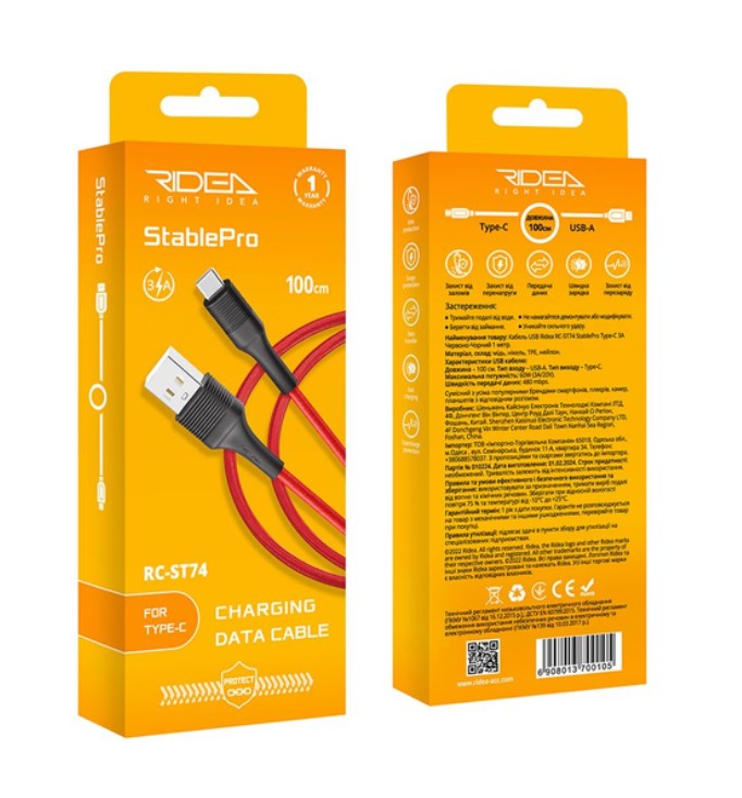 USB Кабель Ridea RC-ST74 StablePro Type C 3A Червоно Чорний