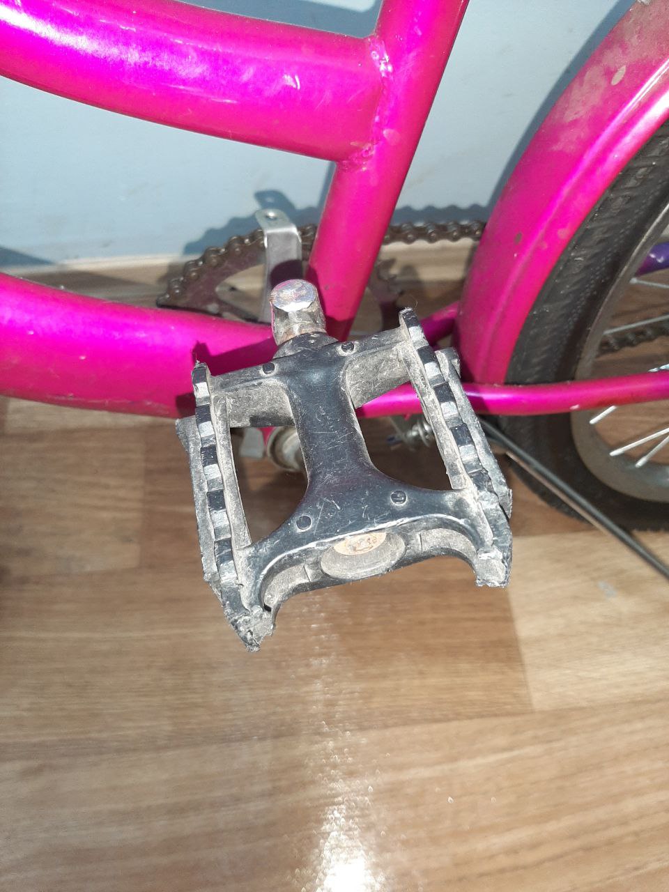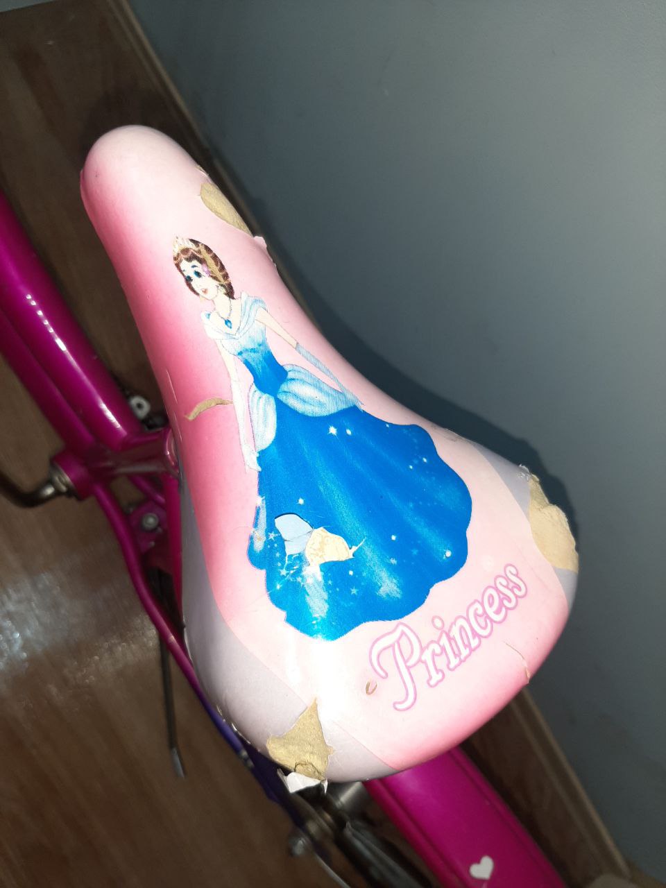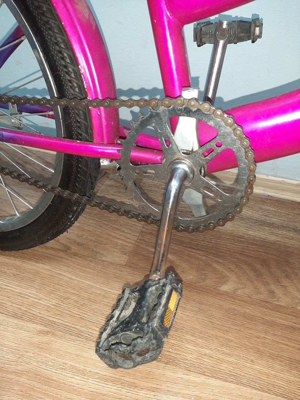 На одній педалі відсутній кусок пластику, на сідлі деформована обшивка.