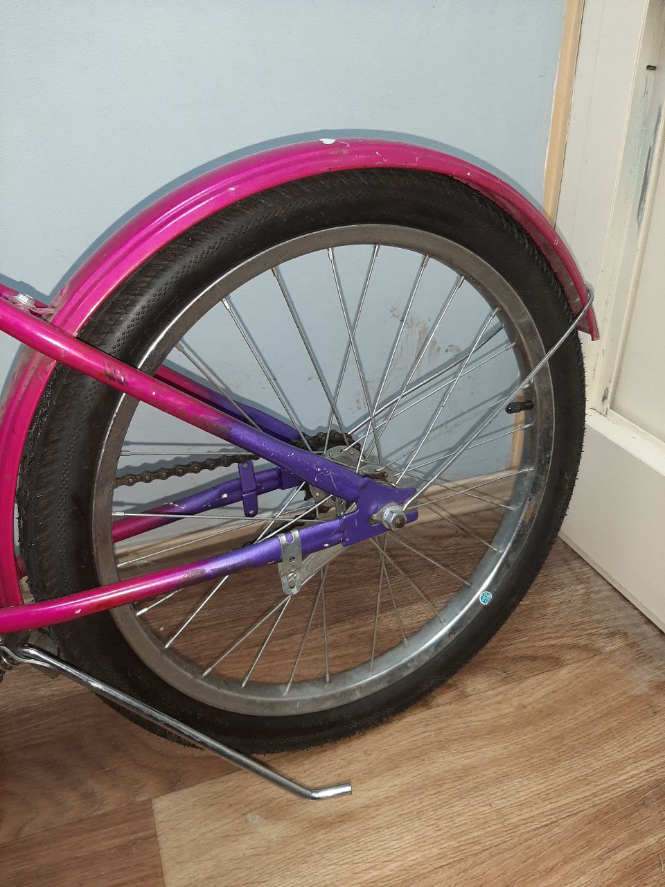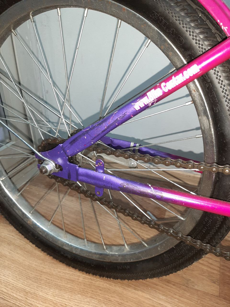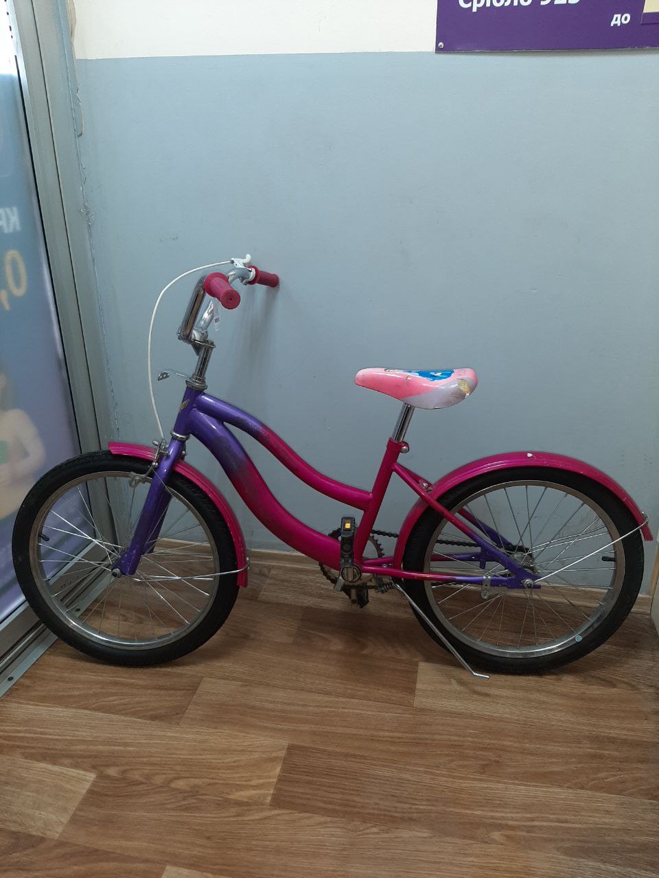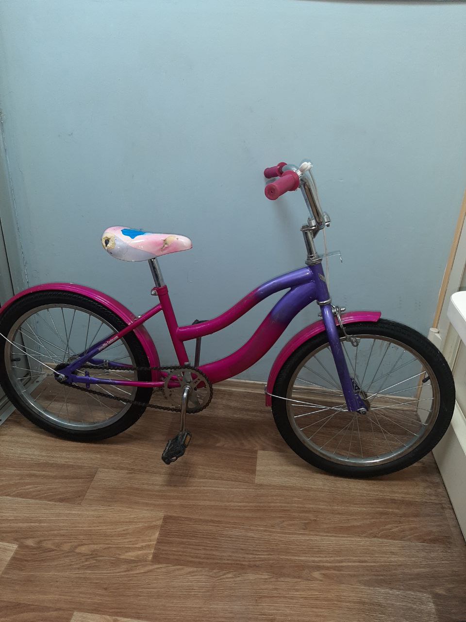 На одній педалі відсутній кусок пластику, на сідлі деформована обшивка.