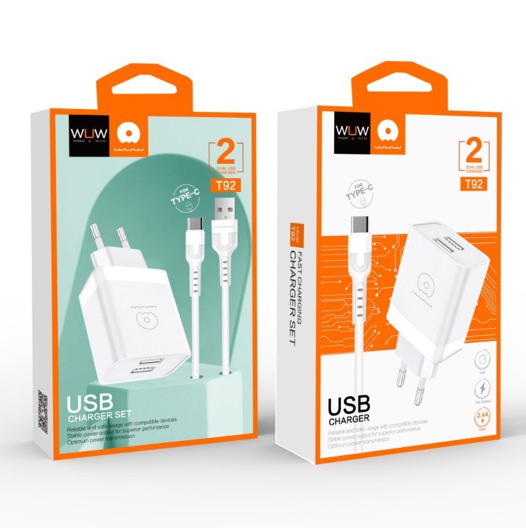 WUW T92 – універсальний мережевий зарядний пристрій з подвійним USB та Type-С/Підтримайте свої пристрої потужною та стабільною зарядкою за допомогою WUW T92. Завдяки двом USB-виходам та одному портові Type-C, ви зможете заряджати телефон, планшет або інші гаджети одночасно — без черг./Два USB-порти + Type-C — ідеально для підключення декількох пристроїв/Сумарний струм 2,4 A — оптимальний баланс швидкості та безпеки/Сумісність — підходить для смартфонів, планшетів, навушників, Power Bank і т.д./Компактний корпус — зручно брати з собою в дорогу/Захист від перевантаження — ваша техніка буде в безпеці/Обирайте WUW T92 — зарядний пристрій, який поєднує функціональність, безпеку та стиль — і ніколи не залишайте улюблені гаджети без енергії.