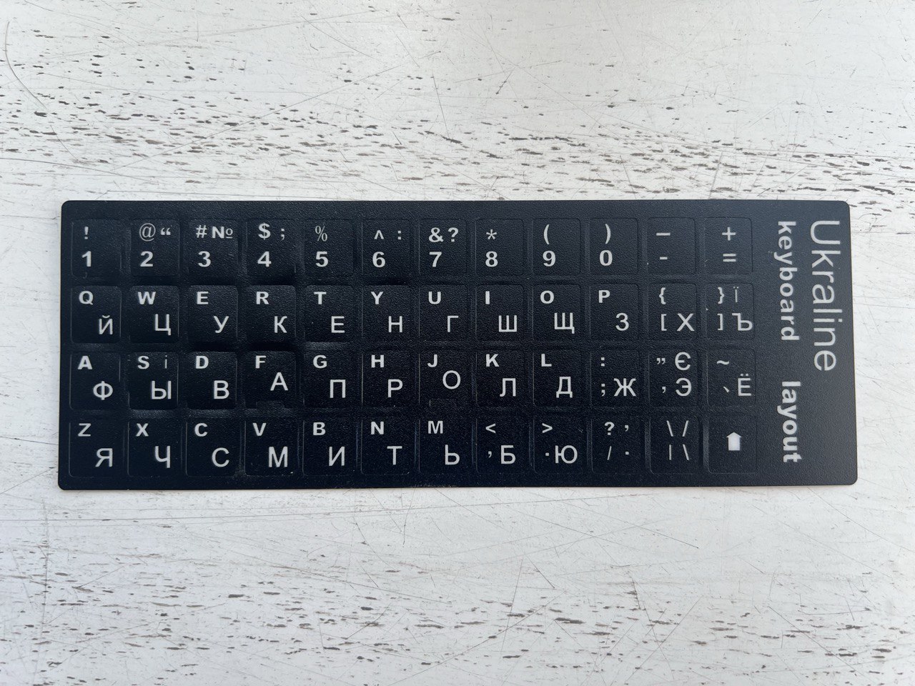 Наклейки на клавіатуру з українською розкладкою Наклейки на клавіатуру з українською розкладкою – це практичний аксесуар для вашого ноутбука чи комп’ютера. Вони допоможуть легко адаптувати клавіатуру до роботи з українською мовою, зберігаючи при цьому оригінальний вигляд вашого пристрою. Основні характеристики: Мова: Українська (кирилиця). Матеріал: Високоякісна матова плівка з ламінованим покриттям для захисту від стирання. Сумісність: Підходить для стандартних клавіатур (настільних ПК та ноутбуків). Колір наклейок: Чорний фон із білими символами. Легке наклеювання: Самоклеюча основа забезпечує просте встановлення без бульбашок повітря. Переваги: Практичність: Ідеальне рішення для користувачів, які часто друкують українською мовою. Довговічність: Ламіноване покриття захищає наклейки від зносу та впливу зовнішніх факторів. Естетика: Наклейки органічно виглядають на клавіатурі, не погіршуючи її дизайну. Кому підійдуть: Для студентів, офісних працівників, перекладачів та всіх, хто потребує комфортного введення тексту українською мовою. Ідеально для оновлення старих клавіатур із вицвілими символами. Оновіть свою клавіатуру швидко та зручно з наклейками для української розкладки!
