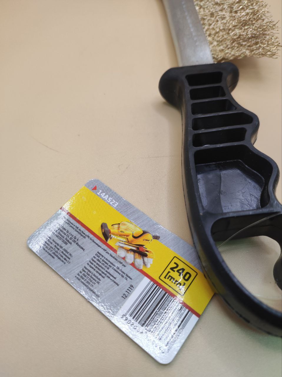 Універсальна ручна дротяна щітка для очищення металевих та інших поверхонь від іржі, забруднень і лакофарбових залишків. Має пластмасову ергономічну ручку та латунований рифлений сталевий дріт для зручної роботи в побуті і на будмайданчику.