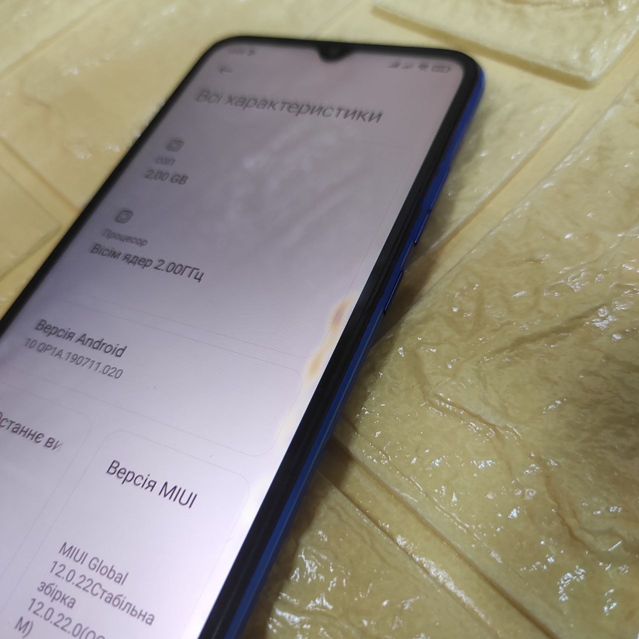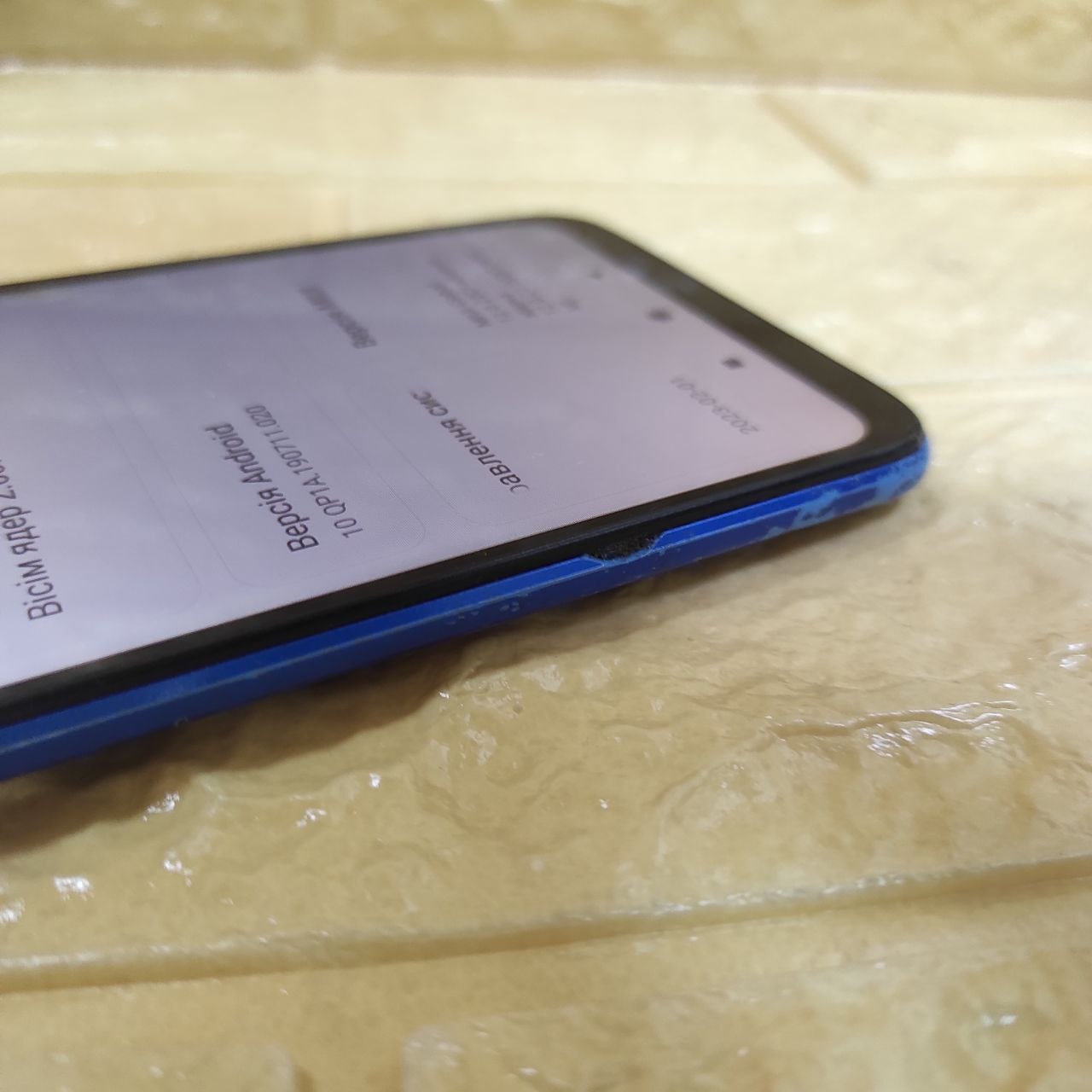 Сильні подряпини і сколи по периметру корпусу. Тріщина на екрані Жовта пляма на екрані. Побито скло камери. Мутна камера.