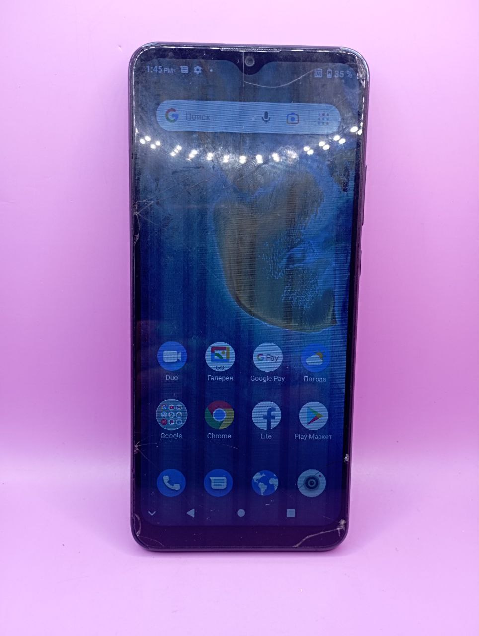 Задовільний стан; сліди використання; тріщини на екрані; скол на сім холдері; полоси на екрані; батарея тримає погано; динаміки трохи репять; мутна фронтальна камера; потертості по корпусу.